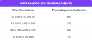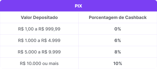 • O valor do cashback varia conforme o montante depositado e a forma de pagamento, podendo chegar a 10%.